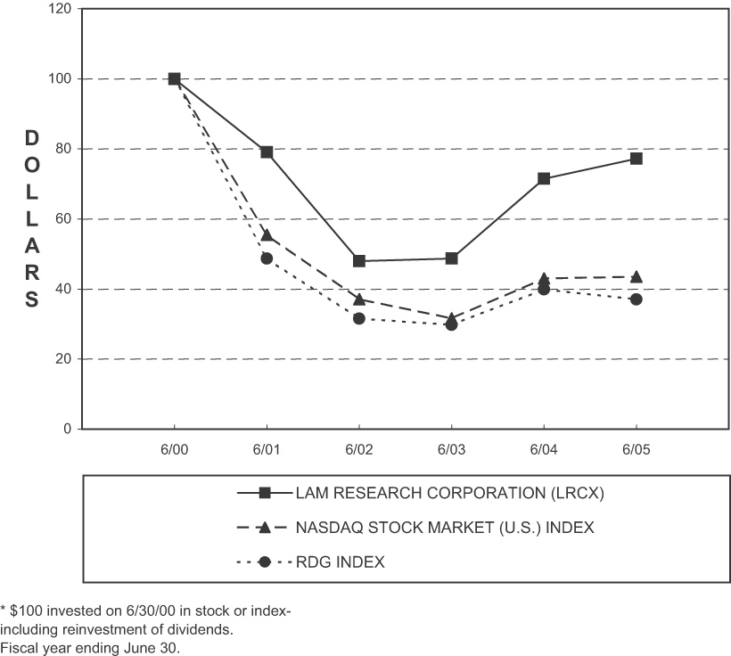 The undersigned stockholder of LAM RESEARCH CORPORATION, a Delaware corporation (the Company), hereby acknowledges receipt of the Notice of Annual Meeting of Stockholders and Proxy Statement, each dated October 3, 2005, and the 2005 Annual Report to Stockholders, and hereby appoints Stephen G. Newberry and George M. Schisler, Jr., or either of them, proxy holders and attorneys-in-fact, with full power to each of substitution, on behalf and in the name of the undersigned, to represent the undersigned at the 2005 Annual Meeting of Stockholders of LAM RESEARCH CORPORATION to be held on November 3, 2005 at 11:00 a.m. local time, at the principal executive offices of the Company at 4650 Cushing Parkway, Fremont, California 94538, and for any adjournment or adjournments thereof, and to vote all shares of Common Stock which the undersigned would be entitled to vote if then and there personally present, on the matters set forth on the reverse side and, in their discretion, upon such other matter or matters which may properly come before the meeting or any adjournment or adjournments thereof.