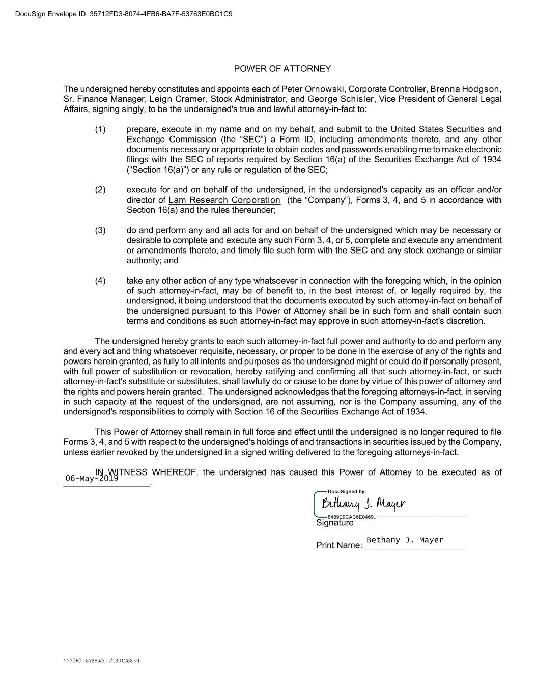 DocuSign Envelope ID: 35712FD3-8074-4FB6-BA7F-53763E0BC1C9 POWER OF ATTORNEY The undersigned hereby constitutes and appoints each of Peter Ornowski, Corporate Controller, Brenna Hodgson, Sr. Finance Manager, Leign Cramer, Stock Administrator, and George Schisler, Vice President of General Legal Affairs, signing singly, to be the undersigned's true and lawful attorney-in-fact to: (1) prepare, execute in my name and on my behalf, and submit to the United States Securities and Exchange Commission (the “SEC”) a Form ID, including amendments thereto, and any other documents necessary or appropriate to obtain codes and passwords enabling me to make electronic filings with the SEC of reports required by Section 16(a) of the Securities Exchange Act of 1934 (“Section 16(a)”) or any rule or regulation of the SEC; (2) execute for and on behalf of the undersigned, in the undersigned's capacity as an officer and/or director of Lam Research Corporation (the “Company”), Forms 3, 4, and 5 in accordance with Section 16(a) and the rules thereunder; (3) do and perform any and all acts for and on behalf of the undersigned which may be necessary or desirable to complete and execute any such Form 3, 4, or 5, complete and execute any amendment or amendments thereto, and timely file such form with the SEC and any stock exchange or similar authority; and (4) take any other action of any type whatsoever in connection with the foregoing which, in the opinion of such attorney-in-fact, may be of benefit to, in the best interest of, or legally required by, the undersigned, it being understood that the documents executed by such attorney-in-fact on behalf of the undersigned pursuant to this Power of Attorney shall be in such form and shall contain such terms and conditions as such attorney-in-fact may approve in such attorney-in-fact's discretion. The undersigned hereby grants to each such attorney-in-fact full power and authority to do and perform any and every act and thing whatsoever requisite, necessary, or proper to be done in the exercise of any of the rights and powers herein granted, as fully to all intents and purposes as the undersigned might or could do if personally present, with full power of substitution or revocation, hereby ratifying and confirming all that such attorney-in-fact, or such attorney-in-fact's substitute or substitutes, shall lawfully do or cause to be done by virtue of this power of attorney and the rights and powers herein granted. The undersigned acknowledges that the foregoing attorneys-in-fact, in serving in such capacity at the request of the undersigned, are not assuming, nor is the Company assuming, any of the undersigned's responsibilities to comply with Section 16 of the Securities Exchange Act of 1934. This Power of Attorney shall remain in full force and effect until the undersigned is no longer required to file Forms 3, 4, and 5 with respect to the undersigned's holdings of and transactions in securities issued by the Company, unless earlier revoked by the undersigned in a signed writing delivered to the foregoing attorneys-in-fact. IN WITNESS WHEREOF, the undersigned has caused this Power of Attorney to be executed as of __________________.06-May-2019 _______________________________ Signature Bethany J. Mayer Print Name: ___________________ \\\DC - 57385/2 - #1301253 v1
