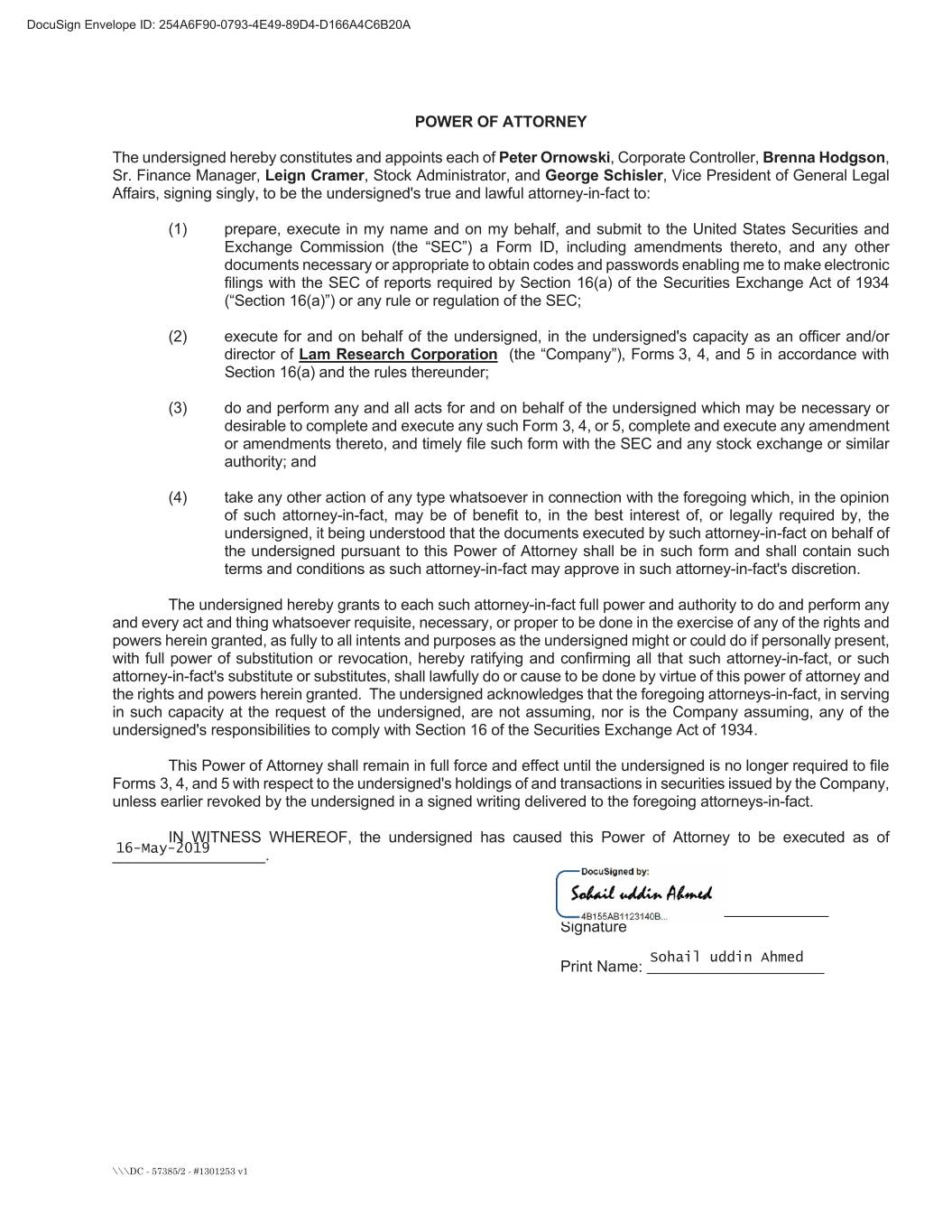 DocuSign Envelope ID: 254A6F90-0793-4E49-89D4-D166A4C6B20A POWER OF ATTORNEY The undersigned hereby constitutes and appoints each of Peter Ornowski, Corporate Controller, Brenna Hodgson, Sr. Finance Manager, Leign Cramer, Stock Administrator, and George Schisler, Vice President of General Legal Affairs, signing singly, to be the undersigned's true and lawful attorney-in-fact to: (1) prepare, execute in my name and on my behalf, and submit to the United States Securities and Exchange Commission (the “SEC”) a Form ID, including amendments thereto, and any other documents necessary or appropriate to obtain codes and passwords enabling me to make electronic filings with the SEC of reports required by Section 16(a) of the Securities Exchange Act of 1934 (“Section 16(a)”) or any rule or regulation of the SEC; (2) execute for and on behalf of the undersigned, in the undersigned's capacity as an officer and/or director of Lam Research Corporation (the “Company”), Forms 3, 4, and 5 in accordance with Section 16(a) and the rules thereunder; (3) do and perform any and all acts for and on behalf of the undersigned which may be necessary or desirable to complete and execute any such Form 3, 4, or 5, complete and execute any amendment or amendments thereto, and timely file such form with the SEC and any stock exchange or similar authority; and (4) take any other action of any type whatsoever in connection with the foregoing which, in the opinion of such attorney-in-fact, may be of benefit to, in the best interest of, or legally required by, the undersigned, it being understood that the documents executed by such attorney-in-fact on behalf of the undersigned pursuant to this Power of Attorney shall be in such form and shall contain such terms and conditions as such attorney-in-fact may approve in such attorney-in-fact's discretion. The undersigned hereby grants to each such attorney-in-fact full power and authority to do and perform any and every act and thing whatsoever requisite, necessary, or proper to be done in the exercise of any of the rights and powers herein granted, as fully to all intents and purposes as the undersigned might or could do if personally present, with full power of substitution or revocation, hereby ratifying and confirming all that such attorney-in-fact, or such attorney-in-fact's substitute or substitutes, shall lawfully do or cause to be done by virtue of this power of attorney and the rights and powers herein granted. The undersigned acknowledges that the foregoing attorneys-in-fact, in serving in such capacity at the request of the undersigned, are not assuming, nor is the Company assuming, any of the undersigned's responsibilities to comply with Section 16 of the Securities Exchange Act of 1934. This Power of Attorney shall remain in full force and effect until the undersigned is no longer required to file Forms 3, 4, and 5 with respect to the undersigned's holdings of and transactions in securities issued by the Company, unless earlier revoked by the undersigned in a signed writing delivered to the foregoing attorneys-in-fact. IN WITNESS WHEREOF, the undersigned has caused this Power of Attorney to be executed as of __________________. _______________________________ Signature Print Name: ___________________ \\\DC - 57385/2 - #1301253 v1